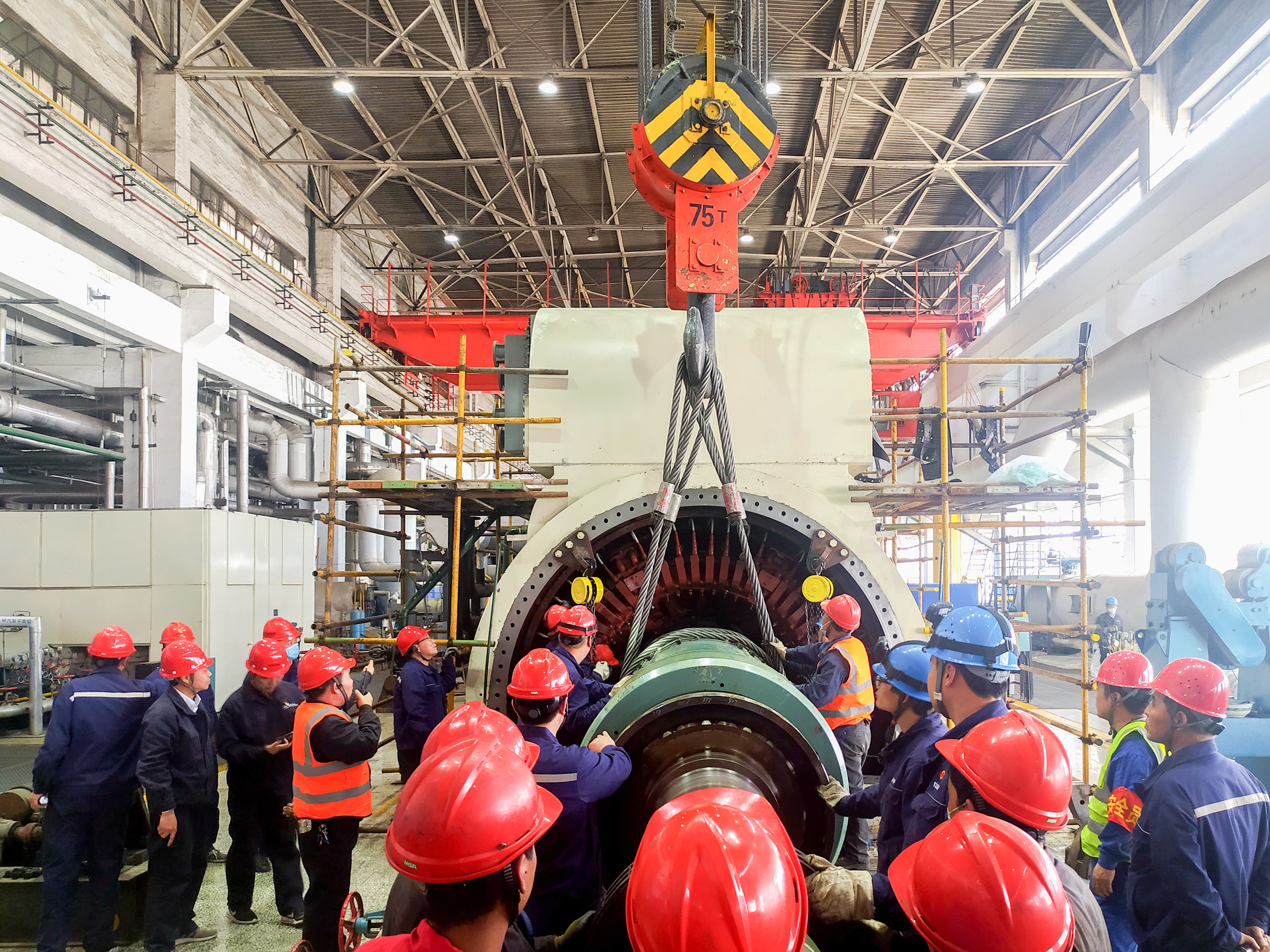 開工前,公司副總經(jīng)理武紅親臨現(xiàn)場,對回穿工作進(jìn)行指導(dǎo)。渭河項(xiàng)目部精心編制作業(yè)指導(dǎo)書,召開安全、技術(shù)交底會,明確分工,落實(shí)責(zé)任,相關(guān)專業(yè)加班加點(diǎn)完成了膛內(nèi)異物清理、風(fēng)區(qū)隔板安裝等前期工作,為穿裝工作提供了可靠保障。經(jīng)過吊裝、平移、牽引等一系列工序后,轉(zhuǎn)子平穩(wěn)地回到定子線膛內(nèi),為后續(xù)機(jī)組試驗(yàn)、調(diào)試創(chuàng)造了有利條件。