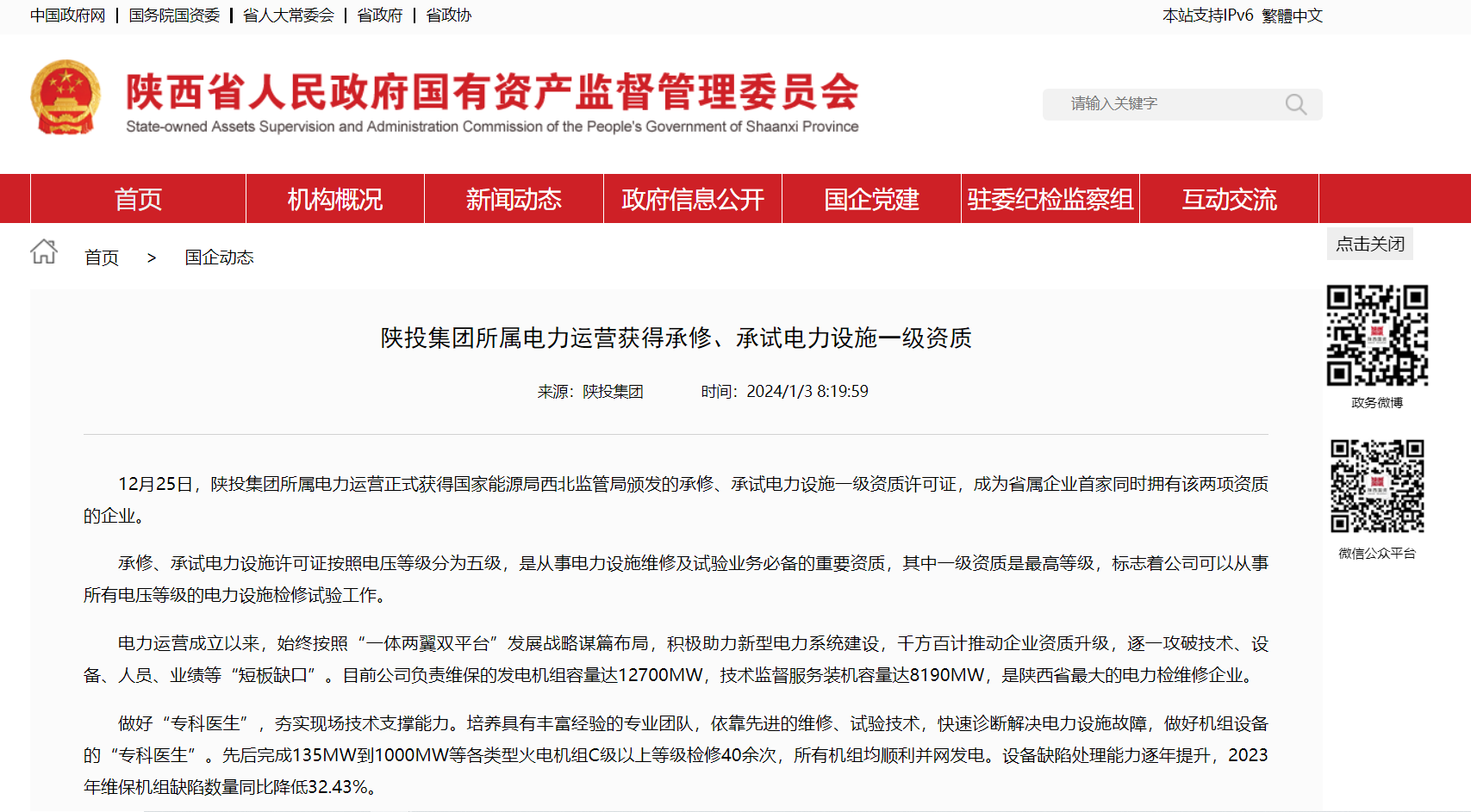 12月25日,陜投集團(tuán)所屬電力運(yùn)營(yíng)正式獲得國(guó)家能源局西北監(jiān)管局頒發(fā)的承修、承試電力設(shè)施一級(jí)資質(zhì)許可證,成為省屬企業(yè)首家同時(shí)擁有該兩項(xiàng)資質(zhì)的企業(yè)。