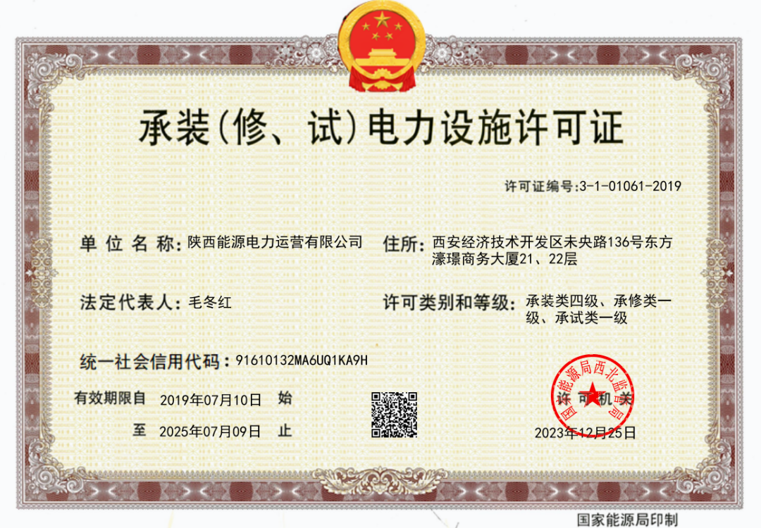 12月25日,公司正式獲得國家能源局西北監(jiān)管局頒發(fā)的承修、承試電力設(shè)施一級資質(zhì)許可證,成為陜西省第7家同時擁有該兩項(xiàng)資質(zhì)的企業(yè),公司資質(zhì)建設(shè)取得新突破。