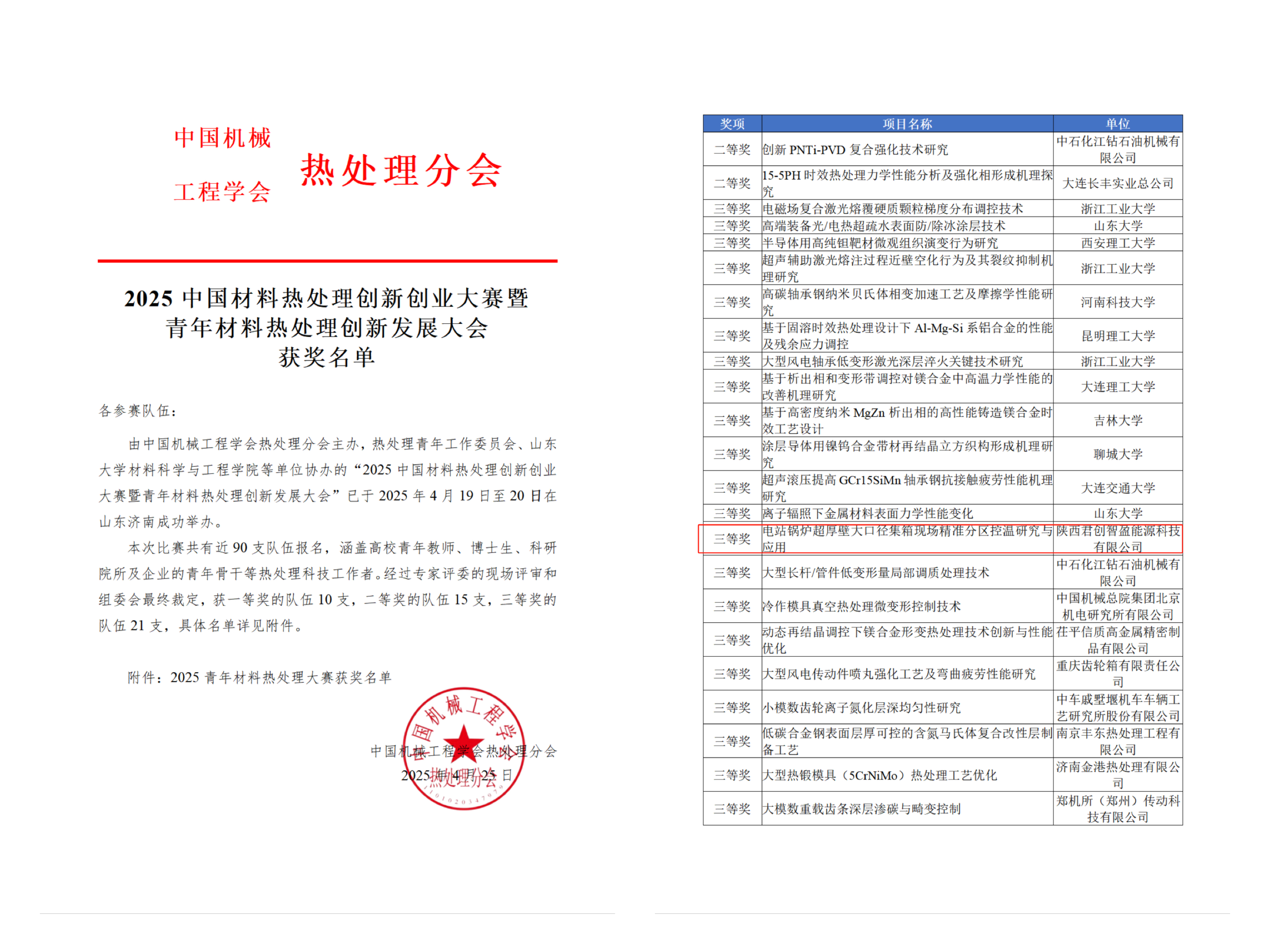 近日,君創(chuàng)科技《電站鍋爐超厚壁大口徑集箱現(xiàn)場精準(zhǔn)分區(qū)控溫研究與應(yīng)用》榮獲2025中國材料熱處理創(chuàng)新創(chuàng)業(yè)大賽暨青年材料熱處理創(chuàng)新發(fā)展大會中榮獲三等獎(jiǎng)。