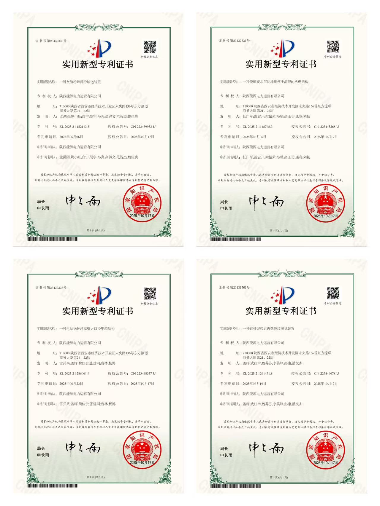 “一種電站鍋爐超厚壁大口徑集箱結(jié)構(gòu)”有效解決了行業(yè)內(nèi)在焊接難度和結(jié)構(gòu)穩(wěn)定性方面的共性難題;“一種鋼材焊接后再熱裂紋測(cè)試裝置”可快速、精準(zhǔn)檢測(cè)焊縫風(fēng)險(xiǎn),提升了設(shè)備長(zhǎng)期運(yùn)行的可靠性;“一種灰渣粉碎篩分輸送裝置”實(shí)現(xiàn)了灰渣處理的一體化與資源化,助力綠色低碳發(fā)展;“一種脫硫廢水沉淀池用便于清理的格柵結(jié)構(gòu)”通過(guò)優(yōu)化設(shè)計(jì),顯著提升環(huán)保系統(tǒng)運(yùn)行效率,為火電企業(yè)環(huán)保達(dá)標(biāo)提供了實(shí)用化技術(shù)解決方案。