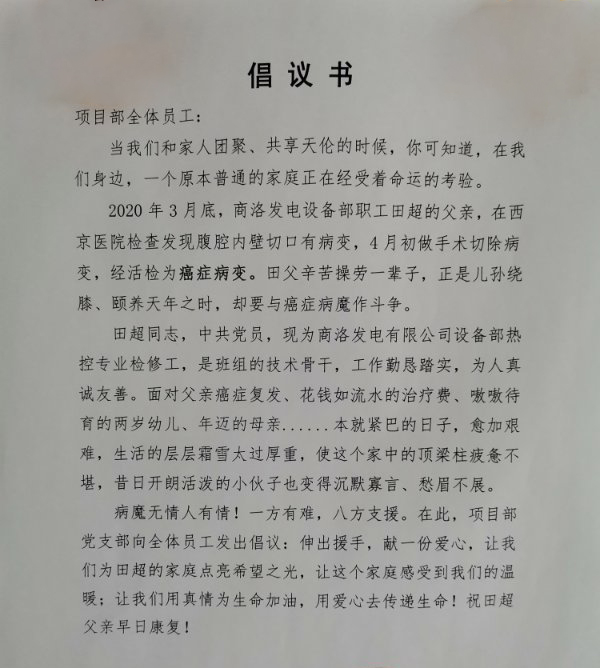近日,商洛發(fā)電設(shè)備部職工田超的父親因患癌癥入院治療。聞知消息后,立即向全體職工發(fā)出捐款倡議,大家伸出援助之手,紛紛慷慨解囊,積極踴躍捐款,以實(shí)際行動(dòng)表達(dá)電力運(yùn)營(yíng)對(duì)兄弟單位員工的關(guān)愛(ài)。