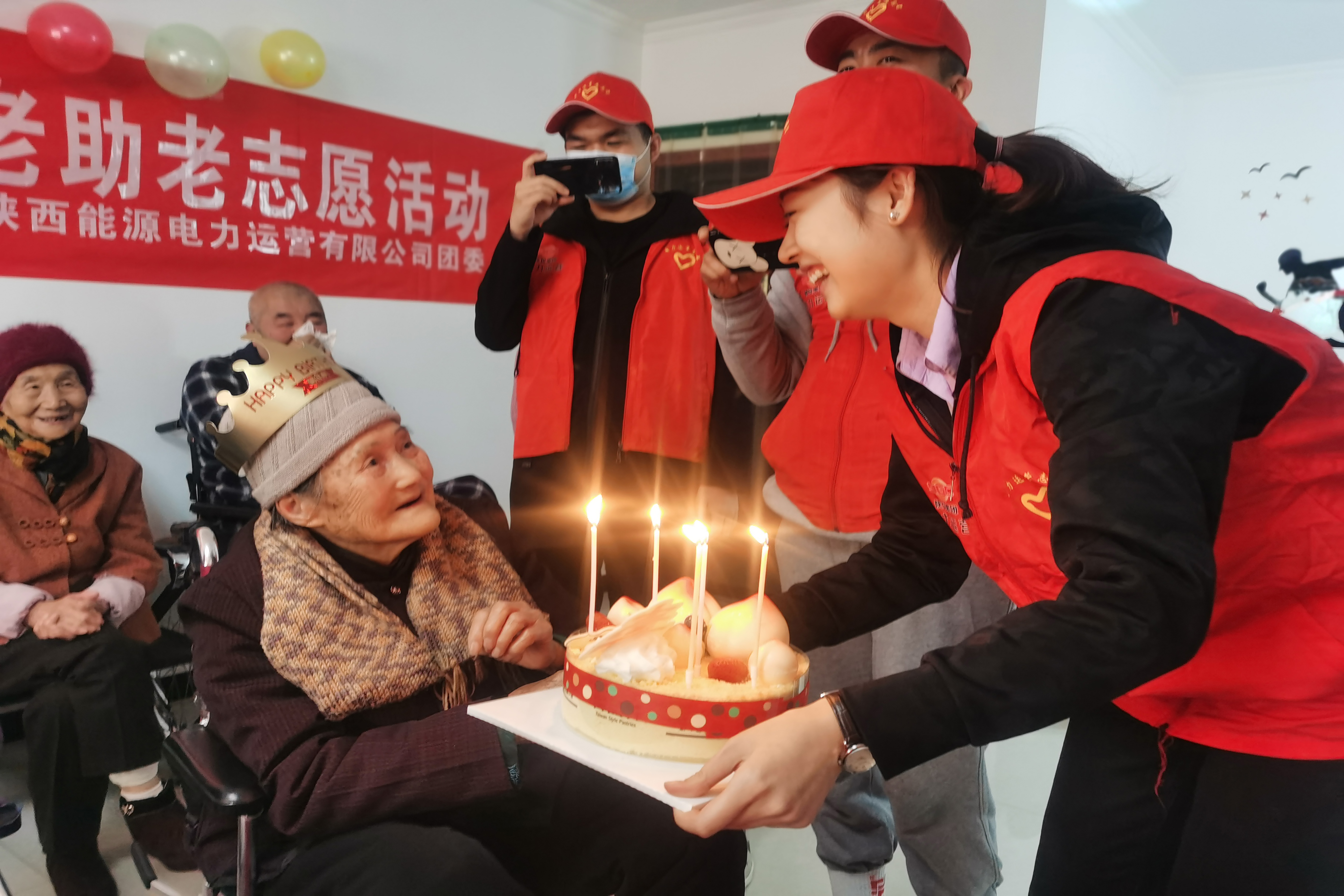志愿者還為兩位過生日的老壽星精心設(shè)計(jì)了生日會(huì),通過唱生日歌、才藝展示及游戲互動(dòng)等環(huán)節(jié)送上生日祝福。兩位老壽星在光影閃爍的蛋糕前許下心愿,伴著聲聲祝福享受著美好時(shí)光。